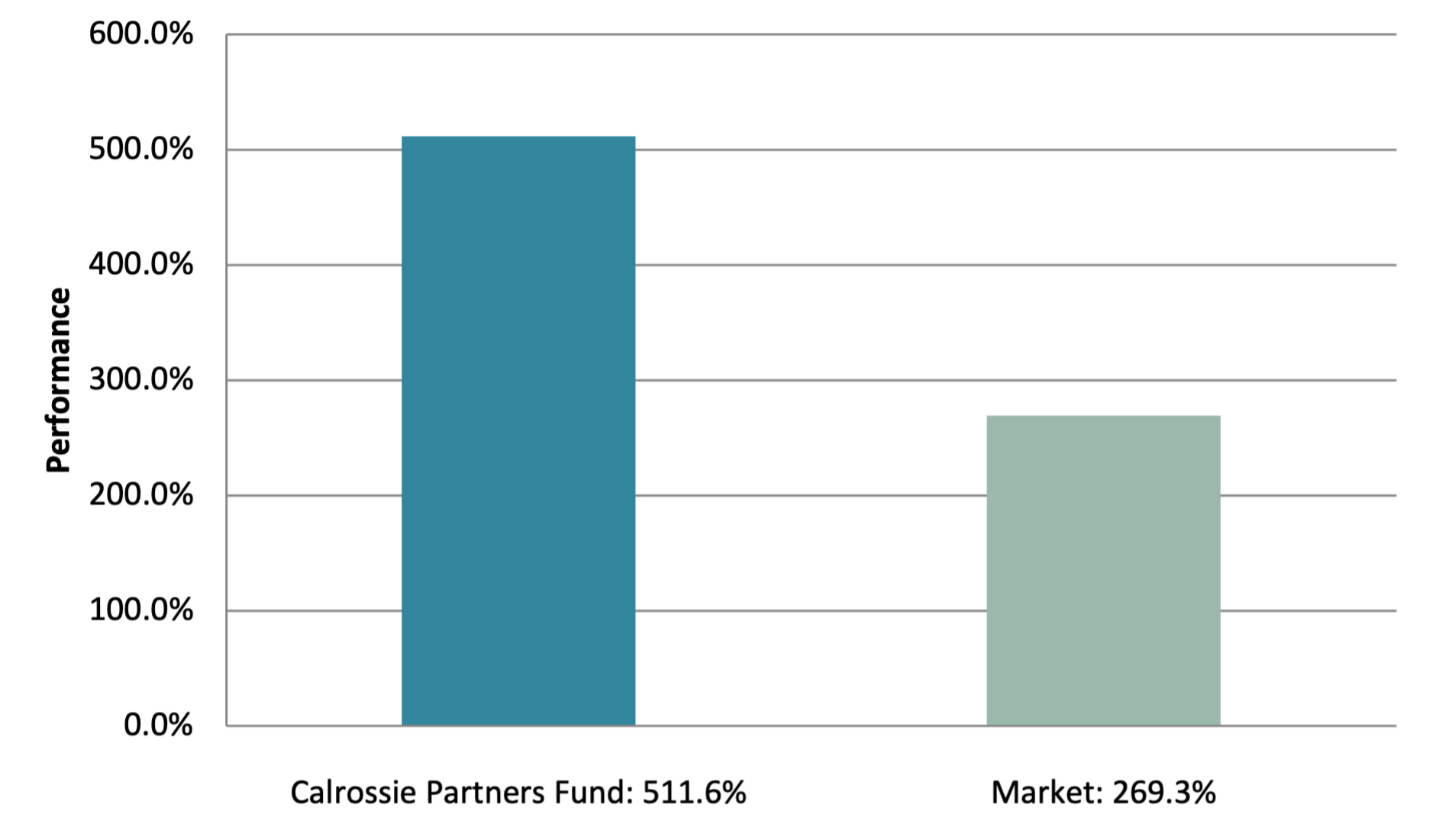 The Calrossie Partners Fund has substantially outperformed the market since inception in 2008. The two graphs below highlight this performance by showing:
